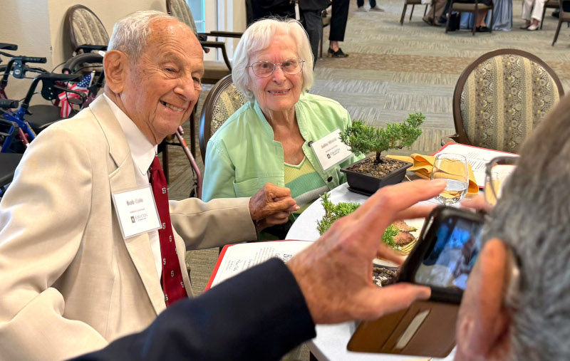 Bob Cole’s son snaps a photo of Bob, 103, with his friend Julia at Eskaton’s centenarian celebration in Carmichael, California, on September 19, 2025. Bob said appreciating family is his secret to longevity.